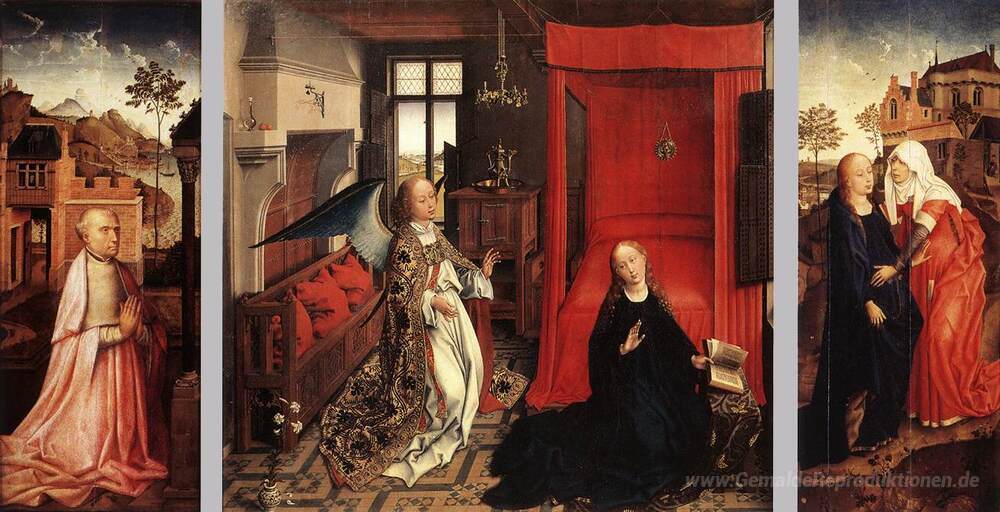 Wir bieten Ihnen eine handgefertigte Reproduktion auf Leinwand des berühmten Kunstwerks 'Die Verkündigung' von Rogier van der Weyden, aus dem Reproduktionsmuseum.
