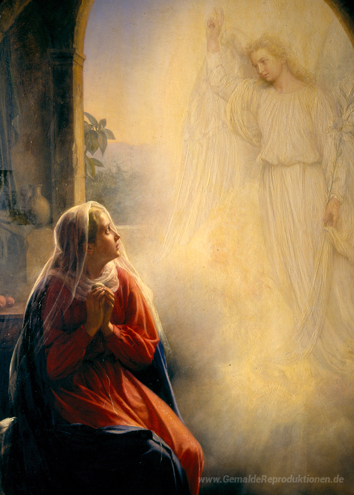 Wir bieten Ihnen eine handgefertigte Reproduktion auf Leinwand des berühmten Kunstwerks 'Die Verkündigung' von Carl Bloch, aus dem Reproduktionsmuseum.