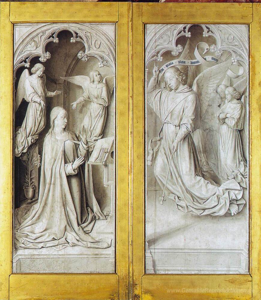 Wir bieten Ihnen eine handgefertigte Reproduktion auf Leinwand des berühmten Kunstwerks 'Die Verkündigung' von Jean Hey, aus dem Reproduktionsmuseum.
