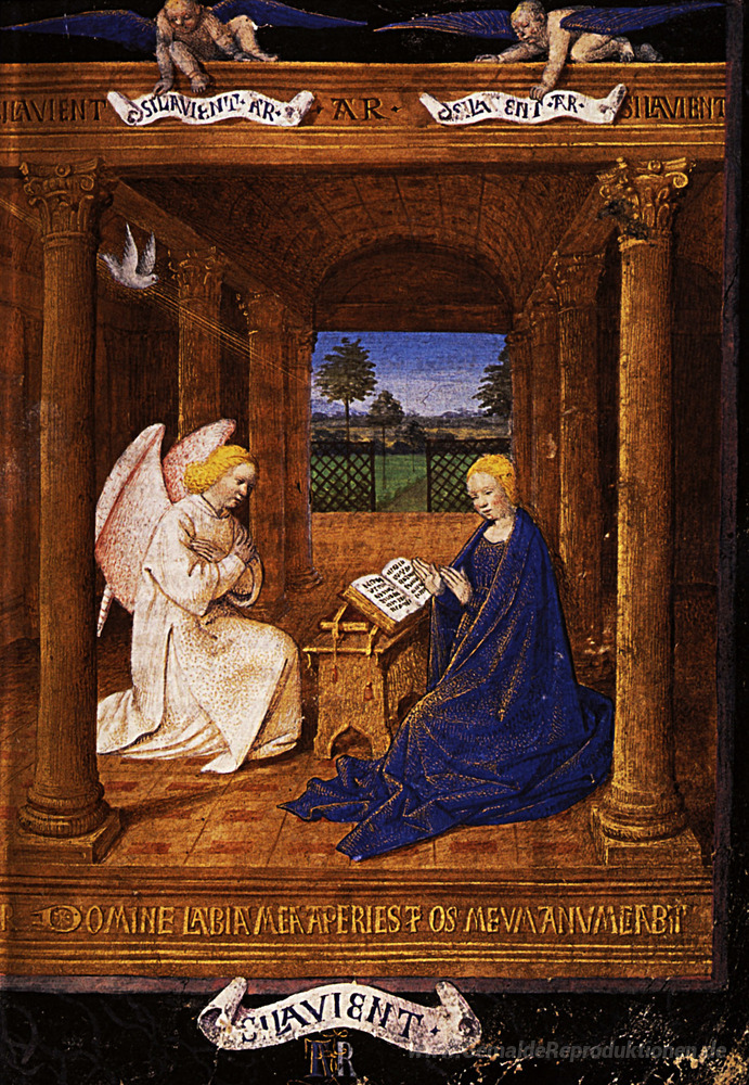 Wir bieten Ihnen eine handgefertigte Reproduktion auf Leinwand des berühmten Kunstwerks 'Die Verkündigung Taube' von Jean Fouquet, aus dem Reproduktionsmuseum.