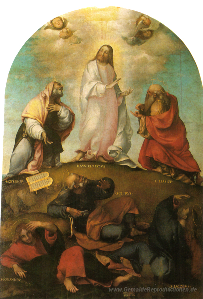 Wir bieten Ihnen eine handgefertigte Reproduktion auf Leinwand des berühmten Kunstwerks 'Die Verklärung Christi' von Lorenzo Lotto, aus dem Reproduktionsmuseum.