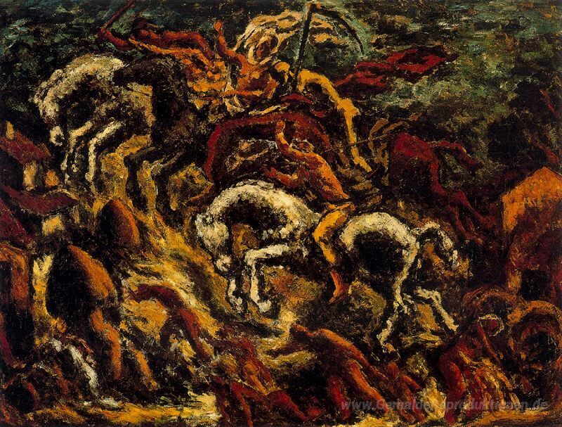 Wir bieten Ihnen eine handgefertigte Reproduktion auf Leinwand des berühmten Kunstwerks 'Die vier Reiter der Apokalypse' von Arturo Souto, aus dem Reproduktionsmuseum.