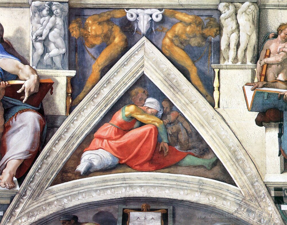 Wir bieten Ihnen eine handgefertigte Reproduktion auf Leinwand des berühmten Kunstwerks 'Die Vorfahren von Chris: Asa' von Michelangelo, aus dem Reproduktionsmuseum.