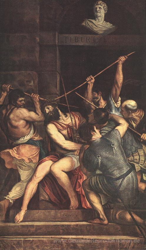 Wir bieten Ihnen eine handgefertigte Reproduktion auf Leinwand des berühmten Kunstwerks 'Dornenkrönung Christi' von Titian, aus dem Reproduktionsmuseum.