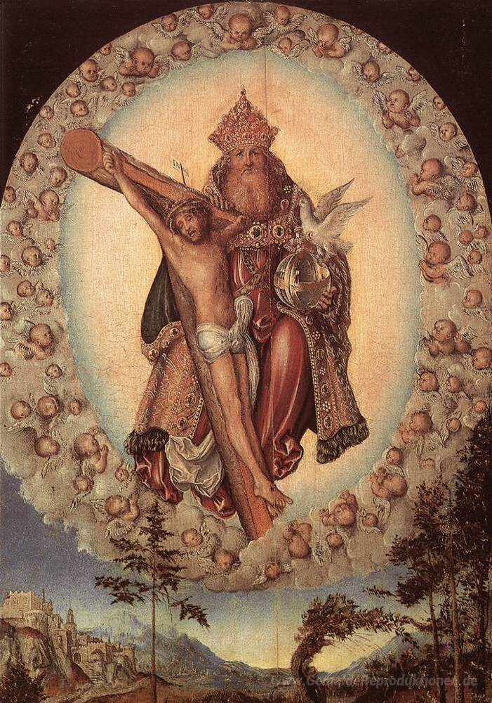 Wir bieten Ihnen eine handgefertigte Reproduktion auf Leinwand des berühmten Kunstwerks 'Dreieinigkeit' von Lucas Cranach the Elder, aus dem Reproduktionsmuseum.