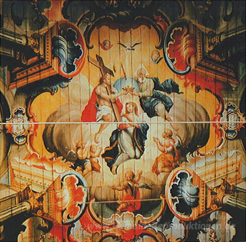 Wir bieten Ihnen eine handgefertigte Reproduktion auf Leinwand des berühmten Kunstwerks 'Ein Coroação da Virgem Pela Santissima Trindade entfernt (Detail' von Mestre Ataíde, aus dem Reproduktionsmuseum.