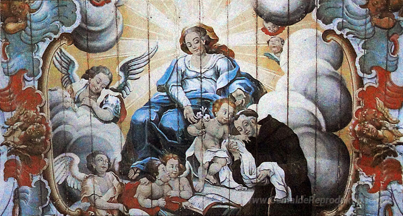 Wir bieten Ihnen eine handgefertigte Reproduktion auf Leinwand des berühmten Kunstwerks 'Ein Virgem entrega o Menino Jesus a Santo Antônio de Pádua (Deta' von Mestre Ataíde, aus dem Reproduktionsmuseum.