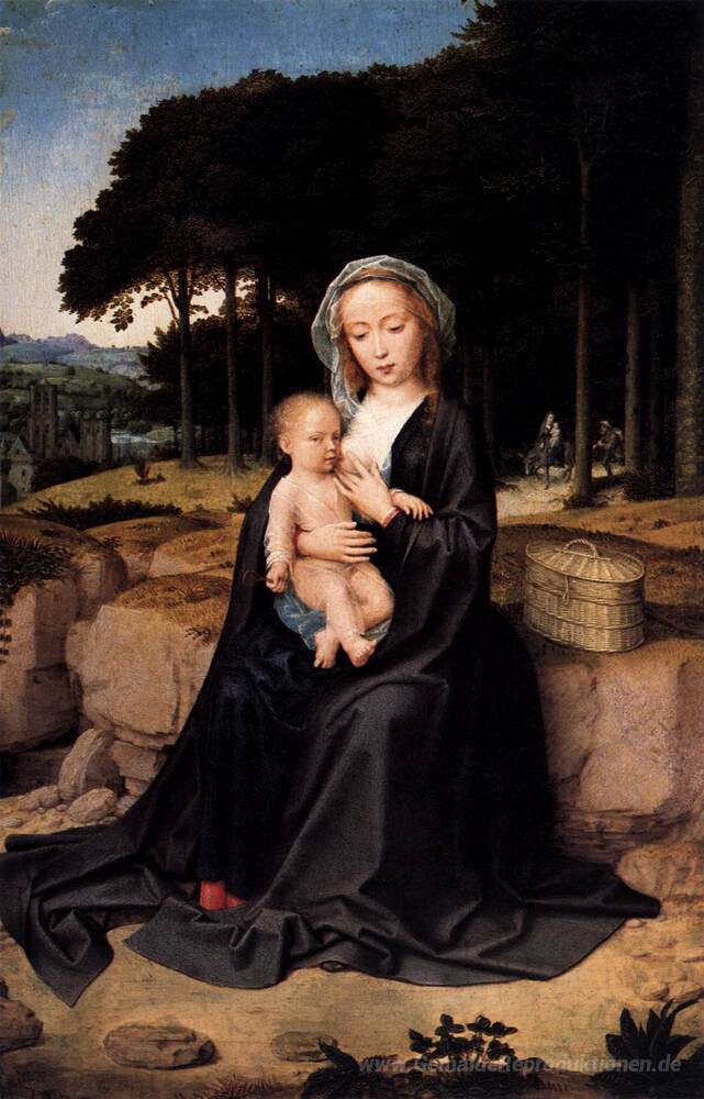 Wir bieten Ihnen eine handgefertigte Reproduktion auf Leinwand des berühmten Kunstwerks 'Eine Ruhe auf der Flucht nach Ägypten' von Gerard David, aus dem Reproduktionsmuseum.