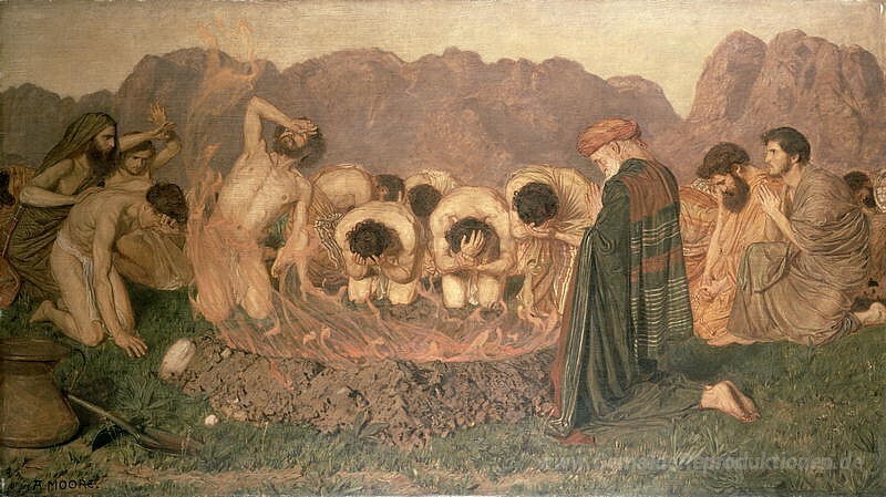 Wir bieten Ihnen eine handgefertigte Reproduktion auf Leinwand des berühmten Kunstwerks 'Elias Sacrifice' von Albert Joseph Moore, aus dem Reproduktionsmuseum.