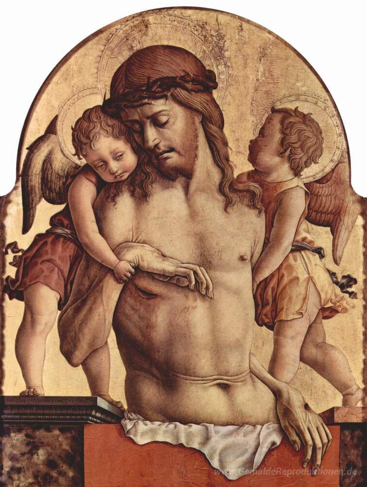 Wir bieten Ihnen eine handgefertigte Reproduktion auf Leinwand des berühmten Kunstwerks 'Engel Pity' von Carlo Crivelli, aus dem Reproduktionsmuseum.