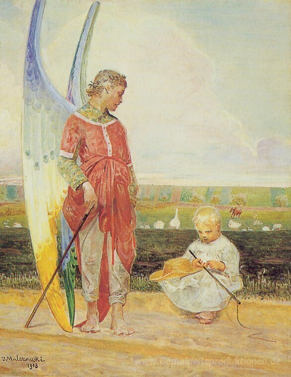 Wir bieten Ihnen eine handgefertigte Reproduktion auf Leinwand des berühmten Kunstwerks 'Engel und der kleine Hirtenjunge' von Jacek Malczewski, aus dem Reproduktionsmuseum.