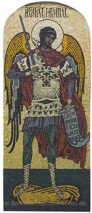 Wir bieten Ihnen eine handgefertigte Reproduktion auf Leinwand des berühmten Kunstwerks 'Erzengel Michael. Mosaik an der Nordseite der Kirche der Jungfra' von Ivan Bilibin, aus dem Reproduktionsmuseum.