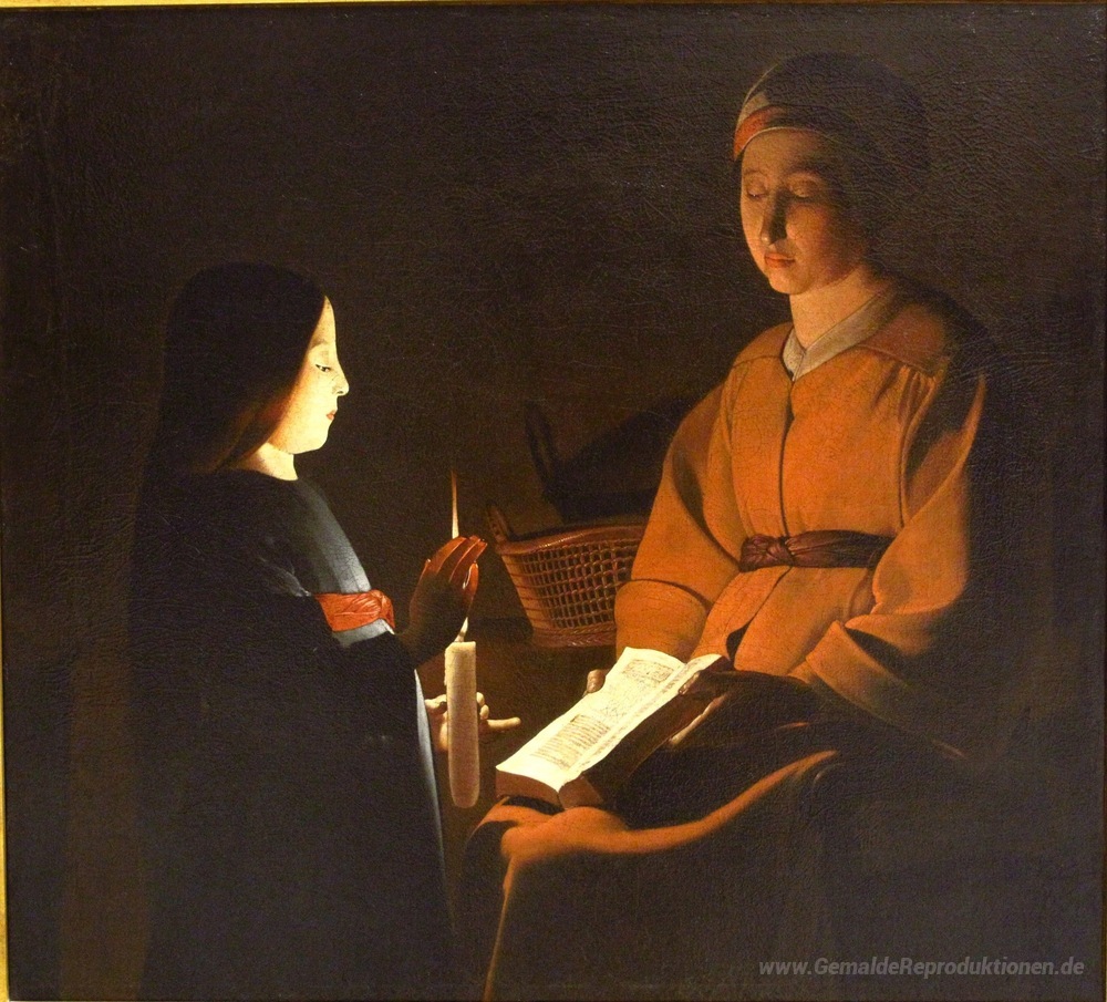 Wir bieten Ihnen eine handgefertigte Reproduktion auf Leinwand des berühmten Kunstwerks 'Erziehung der Jungfrau' von Georges de la Tour, aus dem Reproduktionsmuseum.