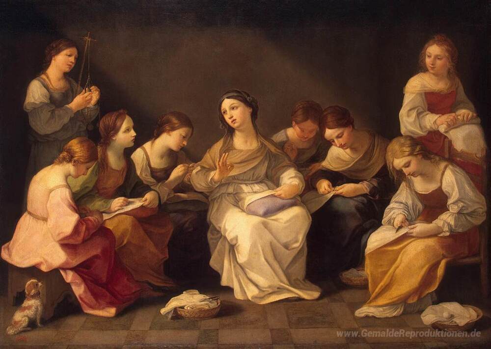 Wir bieten Ihnen eine handgefertigte Reproduktion auf Leinwand des berühmten Kunstwerks 'Erziehung der Jungfrau' von Guido Reni, aus dem Reproduktionsmuseum.