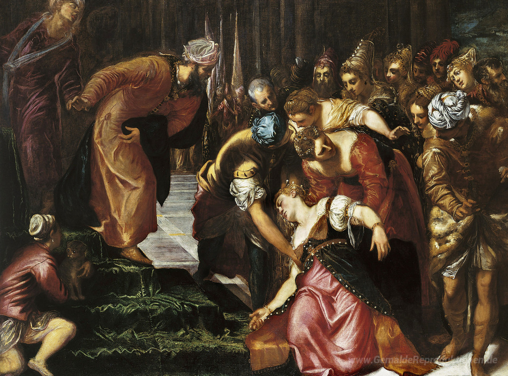 Wir bieten Ihnen eine handgefertigte Reproduktion auf Leinwand des berühmten Kunstwerks 'Esther vor Ahasver' von Tintoretto, aus dem Reproduktionsmuseum.