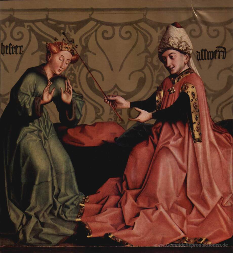 Wir bieten Ihnen eine handgefertigte Reproduktion auf Leinwand des berühmten Kunstwerks 'Esther vor Ahasver' von Konrad Witz, aus dem Reproduktionsmuseum.