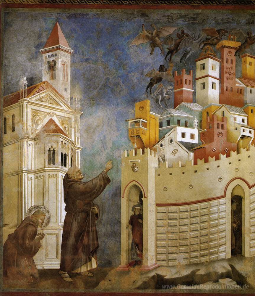 Wir bieten Ihnen eine handgefertigte Reproduktion auf Leinwand des berühmten Kunstwerks 'Exorzismus von Dämonen in Arezzo' von Giotto, aus dem Reproduktionsmuseum.