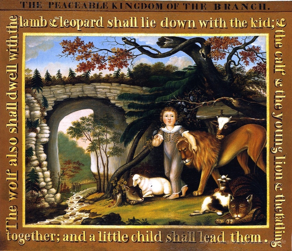 Wir bieten Ihnen eine handgefertigte Reproduktion auf Leinwand des berühmten Kunstwerks 'Friedliches Königreich' von Edward Hicks, aus dem Reproduktionsmuseum.