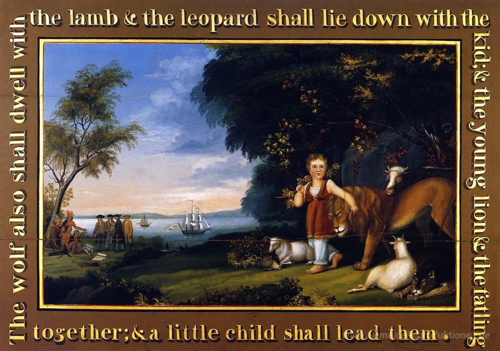 Wir bieten Ihnen eine handgefertigte Reproduktion auf Leinwand des berühmten Kunstwerks 'Friedliches Königreich' von Edward Hicks, aus dem Reproduktionsmuseum.