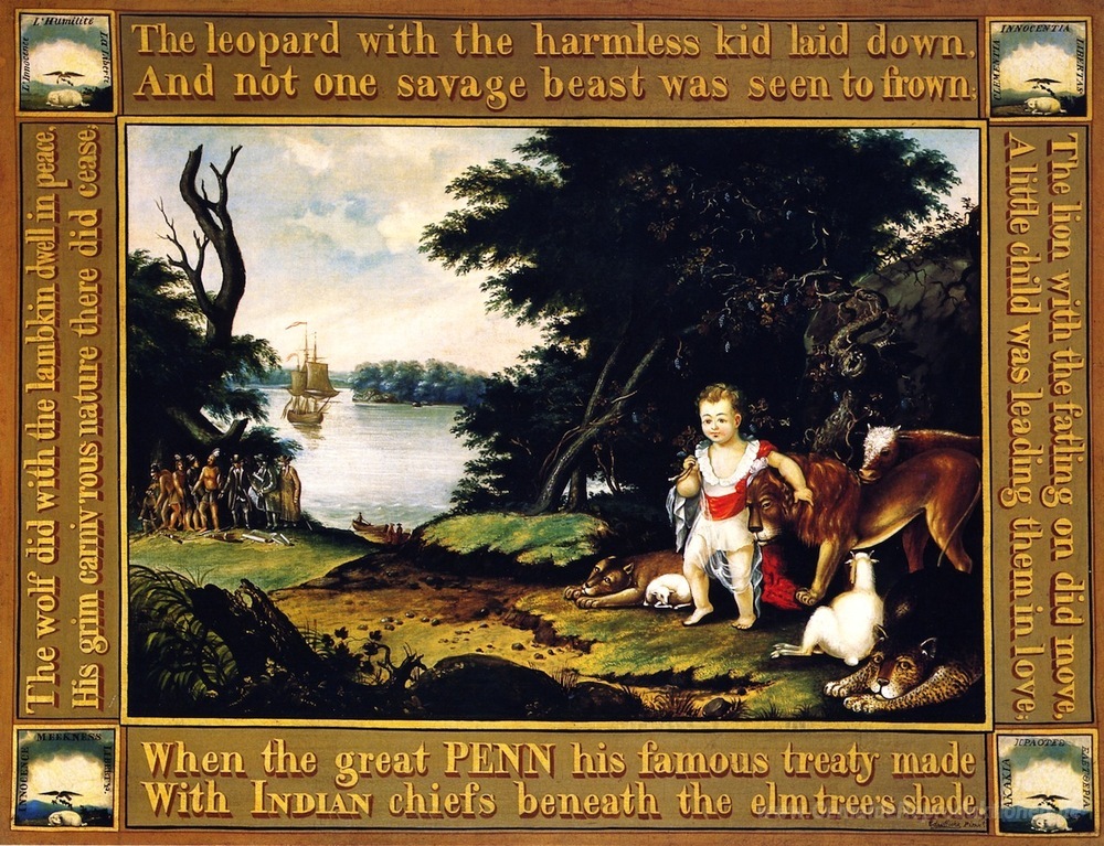 Wir bieten Ihnen eine handgefertigte Reproduktion auf Leinwand des berühmten Kunstwerks 'Friedliches Königreich' von Edward Hicks, aus dem Reproduktionsmuseum.