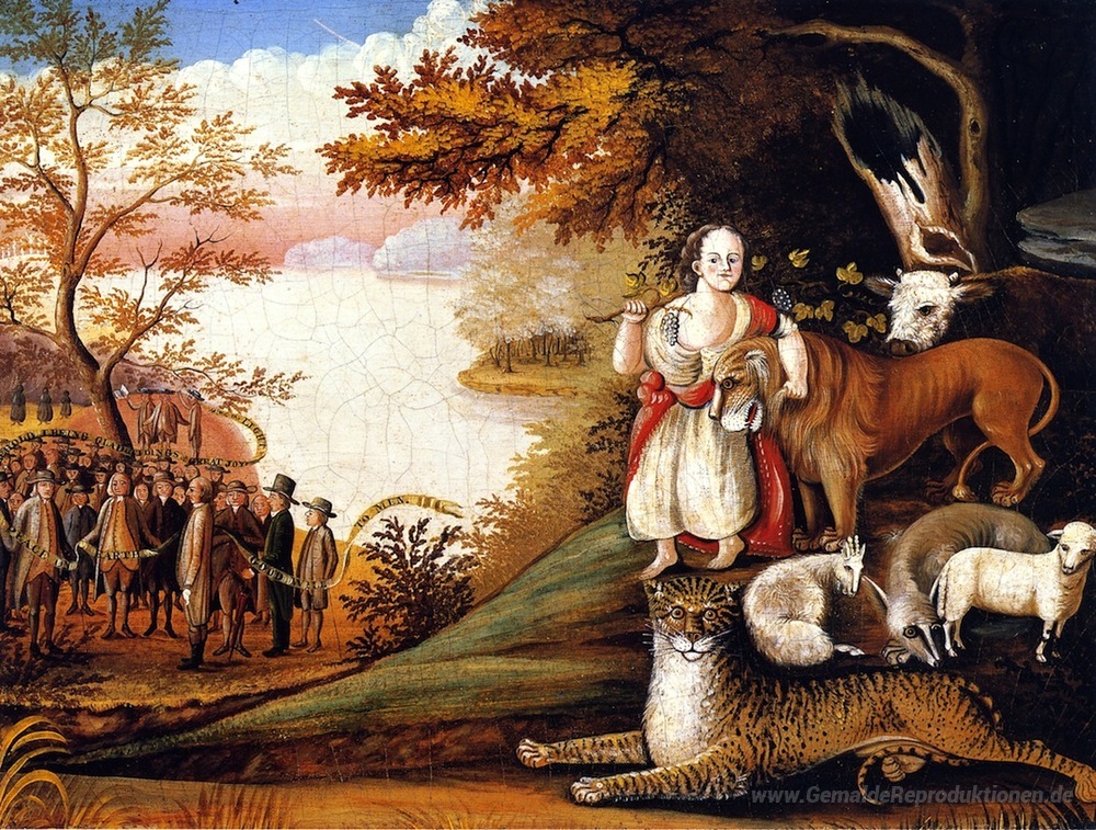 Wir bieten Ihnen eine handgefertigte Reproduktion auf Leinwand des berühmten Kunstwerks 'Friedliches Königreich' von Edward Hicks, aus dem Reproduktionsmuseum.