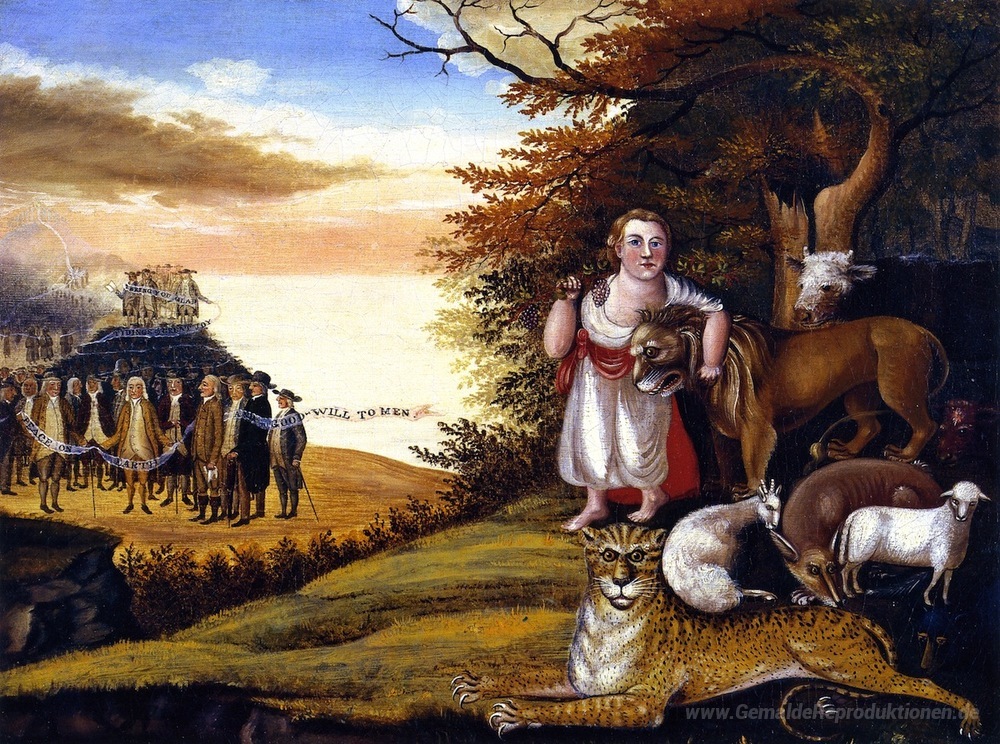 Willkommen in der faszinierenden Welt der Ölgemälde, wo Kunst und Emotion in vollendeter Harmonie verschmelzen. Entdecken Sie das Meisterwerk Friedliches Königreich von Edward Hicks, das sowohl die zeitlose Eleganz als auch die kreative Brillanz des Künstlers verkörpert. Hicks, ein bedeutender amerikanischer Maler des 19. Jahrhunderts, ist bekannt für seine spirituellen Themen und die Verwendung lebendiger Farben, die seinem Werk eine besondere Tiefe verleihen.