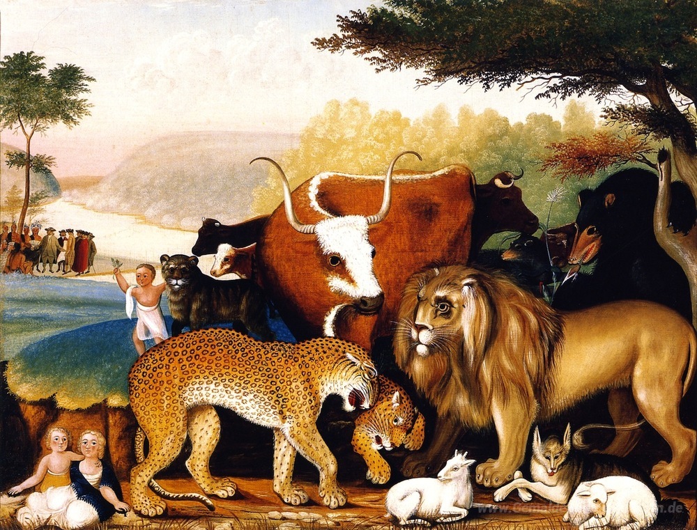 Wir bieten Ihnen eine handgefertigte Reproduktion auf Leinwand des berühmten Kunstwerks 'Friedliches Königreich' von Edward Hicks, aus dem Reproduktionsmuseum.