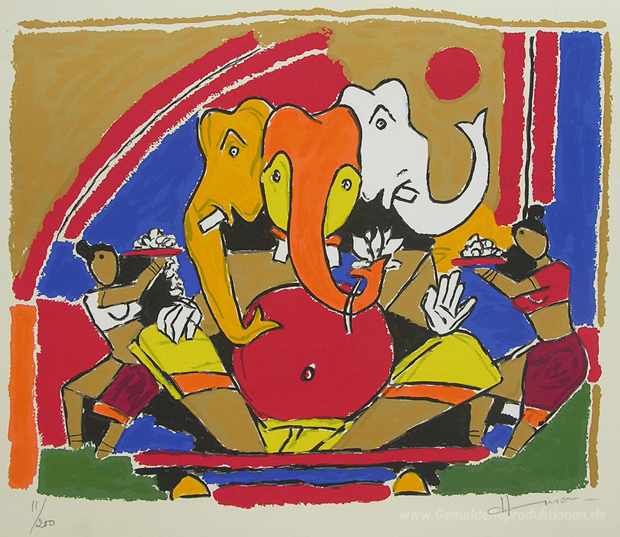 Wir bieten Ihnen eine handgefertigte Reproduktion auf Leinwand des berühmten Kunstwerks 'Ganesh' von M.F. Husain, aus dem Reproduktionsmuseum.