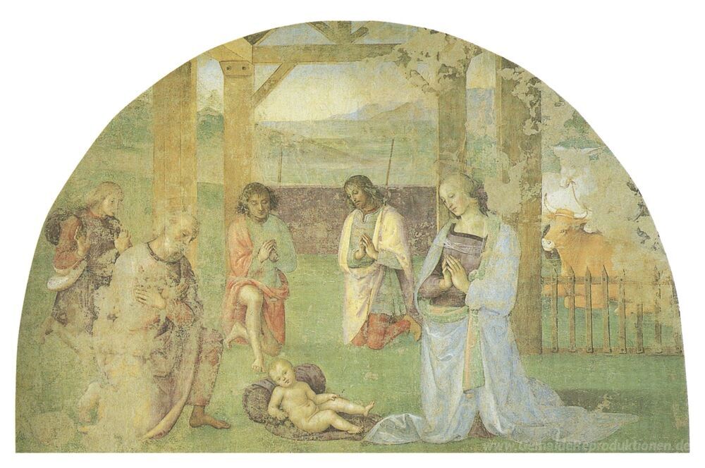 Wir bieten Ihnen eine handgefertigte Reproduktion auf Leinwand des berühmten Kunstwerks 'Geburt' von Pietro Perugino, aus dem Reproduktionsmuseum.