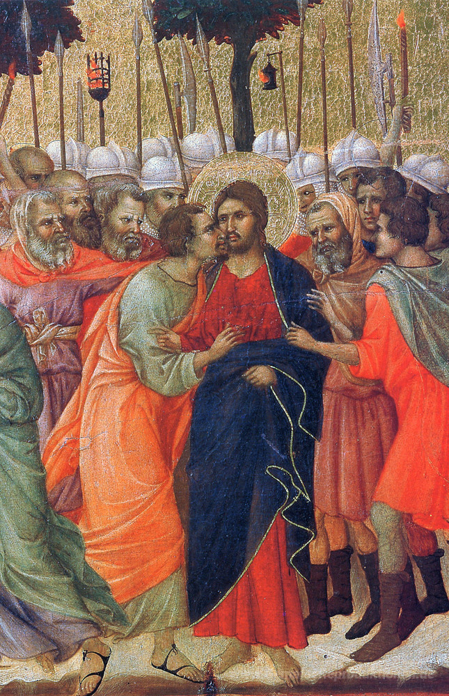 Wir bieten Ihnen eine handgefertigte Reproduktion auf Leinwand des berühmten Kunstwerks 'Gefangennahme Christi (Fragment)' von Duccio, aus dem Reproduktionsmuseum.
