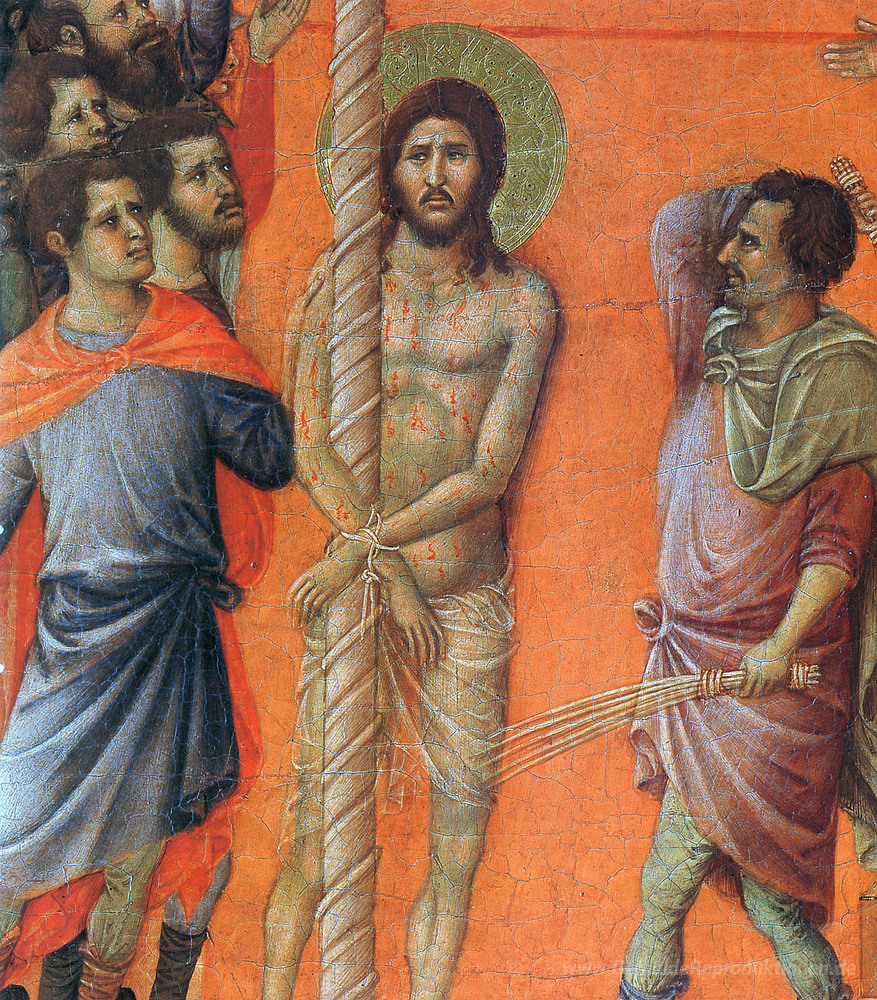 Wir bieten Ihnen eine handgefertigte Reproduktion auf Leinwand des berühmten Kunstwerks 'Geißelung Christi (Fragment)' von Duccio, aus dem Reproduktionsmuseum.