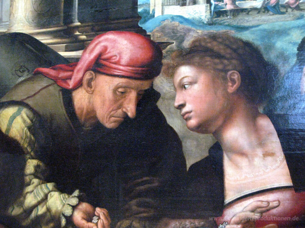 Wir bieten Ihnen eine handgefertigte Reproduktion auf Leinwand des berühmten Kunstwerks 'Gleichnis vom verlorenen Sohn (Detail)' von Jan van Hemessen, aus dem Reproduktionsmuseum.