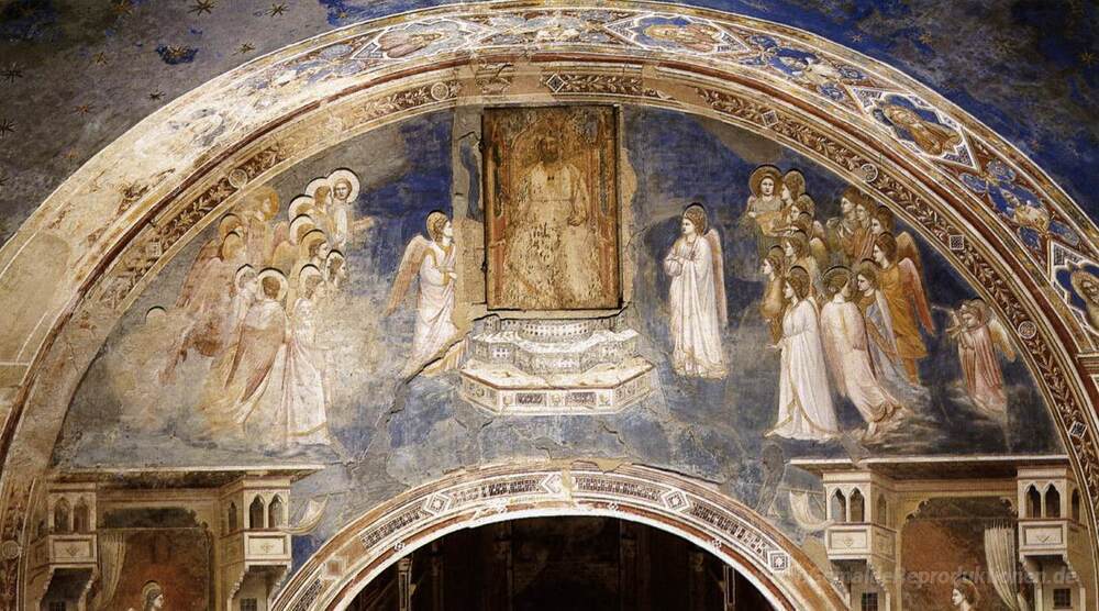 Wir bieten Ihnen eine handgefertigte Reproduktion auf Leinwand des berühmten Kunstwerks 'Gott schickt Gabriel an die Jungfrau Maria' von Giotto, aus dem Reproduktionsmuseum.