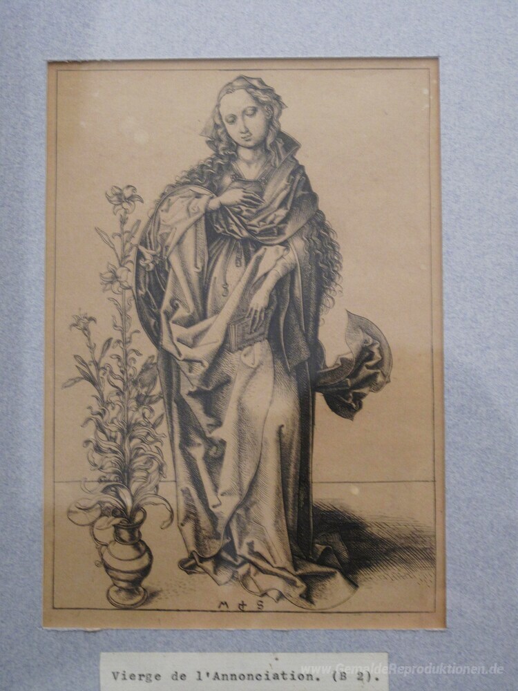 Wir bieten Ihnen eine handgefertigte Reproduktion auf Leinwand des berühmten Kunstwerks 'Gravur auf Kupfer der Verkündigung' von Martin Schongauer, aus dem Reproduktionsmuseum.