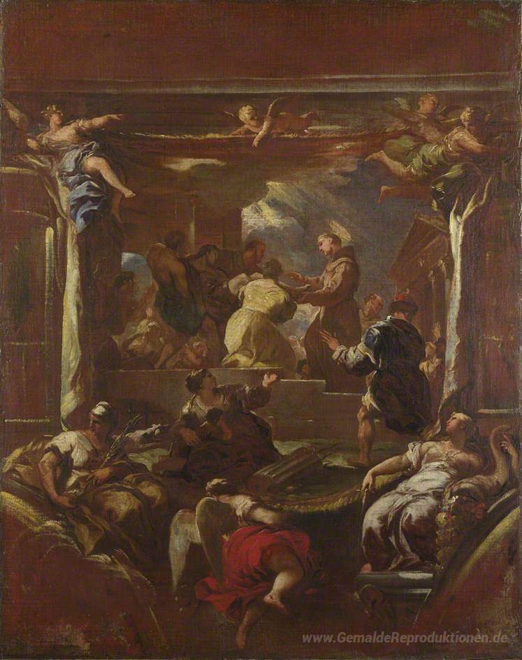 Wir bieten Ihnen eine handgefertigte Reproduktion auf Leinwand des berühmten Kunstwerks 'Heilige Antonius von Padua auf wundersame Weise wieder den Fuß e' von Luca Giordano, aus dem Reproduktionsmuseum.