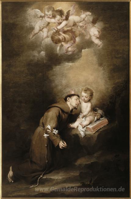 Wir bieten Ihnen eine handgefertigte Reproduktion auf Leinwand des berühmten Kunstwerks 'Heilige Antonius von Padua und das Jesuskind' von Bartolome Esteban Murillo, aus dem Reproduktionsmuseum.