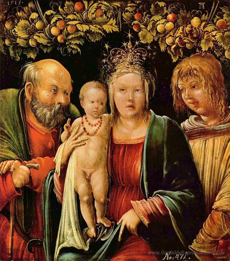 Wir bieten Ihnen eine handgefertigte Reproduktion auf Leinwand des berühmten Kunstwerks 'Heilige Familie mit einem Engel' von Albrecht Altdorfer, aus dem Reproduktionsmuseum.