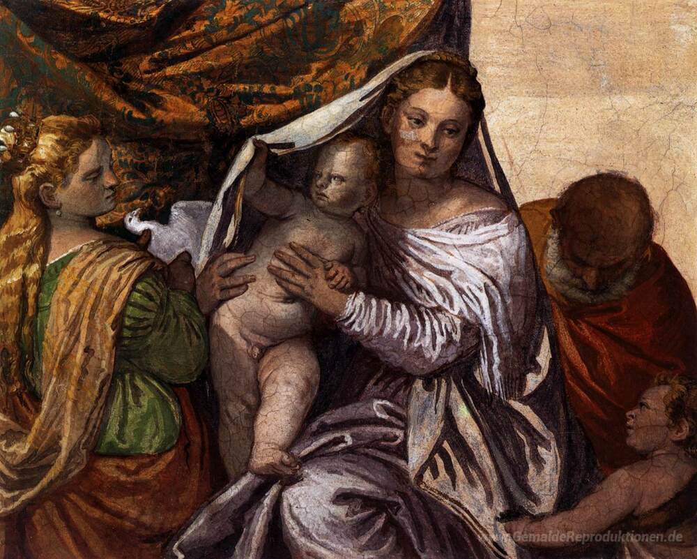 Wir bieten Ihnen eine handgefertigte Reproduktion auf Leinwand des berühmten Kunstwerks 'Heilige Familie mit St. Catherine und dem Jesuskind St. Johannes' von Paolo Veronese, aus dem Reproduktionsmuseum.