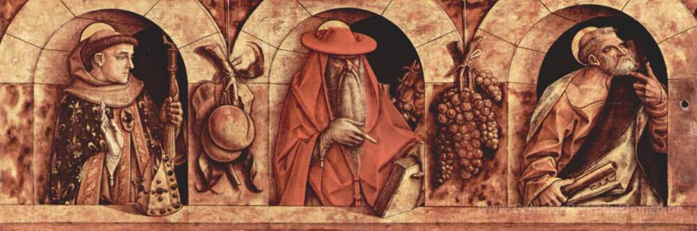 Wir bieten Ihnen eine handgefertigte Reproduktion auf Leinwand des berühmten Kunstwerks 'Heilige Ludwig von Toulouse Heilige Hieronymus Der Heilige Petru' von Carlo Crivelli, aus dem Reproduktionsmuseum.
