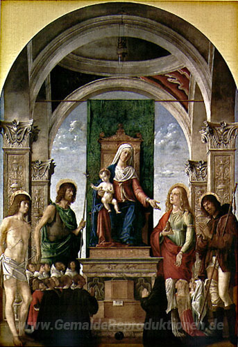 Wir bieten Ihnen eine handgefertigte Reproduktion auf Leinwand des berühmten Kunstwerks 'Heilige Unterhaltung' von Cima da Conegliano, aus dem Reproduktionsmuseum.