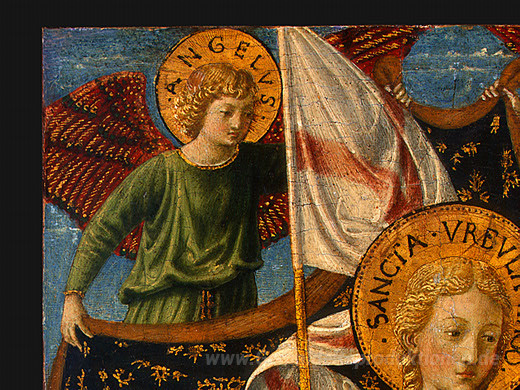 Wir bieten Ihnen eine handgefertigte Reproduktion auf Leinwand des berühmten Kunstwerks 'Heilige Ursula mit Engeln und Spender (Detail)' von Benozzo Gozzoli, aus dem Reproduktionsmuseum.