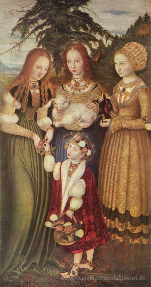 Wir bieten Ihnen eine handgefertigte Reproduktion auf Leinwand des berühmten Kunstwerks 'Heiligen Dorothea, Agnes und Kunigunde' von Lucas Cranach the Elder, aus dem Reproduktionsmuseum.