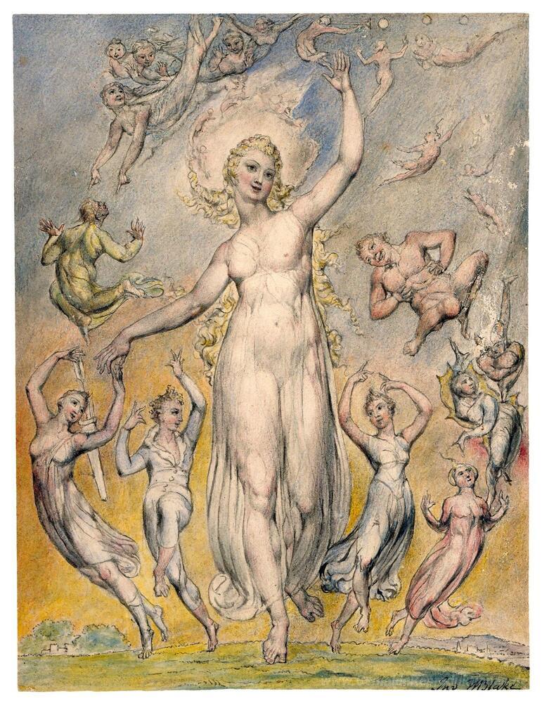 Wir bieten Ihnen eine handgefertigte Reproduktion auf Leinwand des berühmten Kunstwerks 'Heiterkeit' von William Blake, aus dem Reproduktionsmuseum.