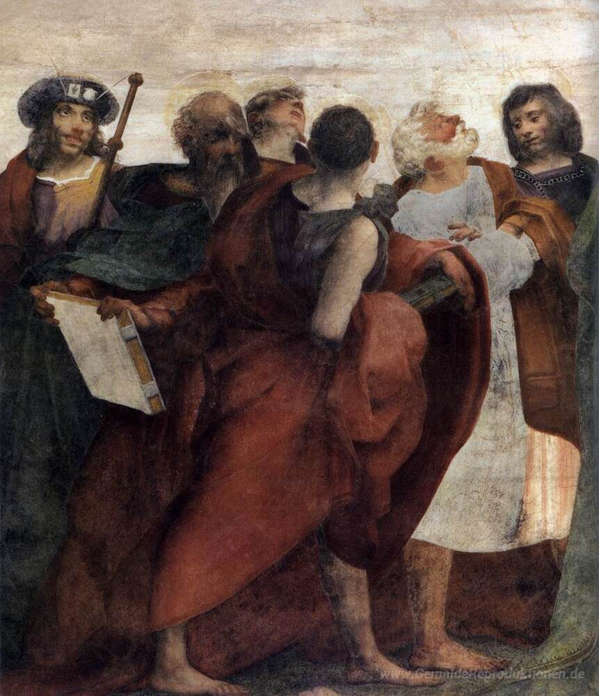 Wir bieten Ihnen eine handgefertigte Reproduktion auf Leinwand des berühmten Kunstwerks 'Himmelfahrt der Jungfrau (Detail)' von Rosso Fiorentino, aus dem Reproduktionsmuseum.