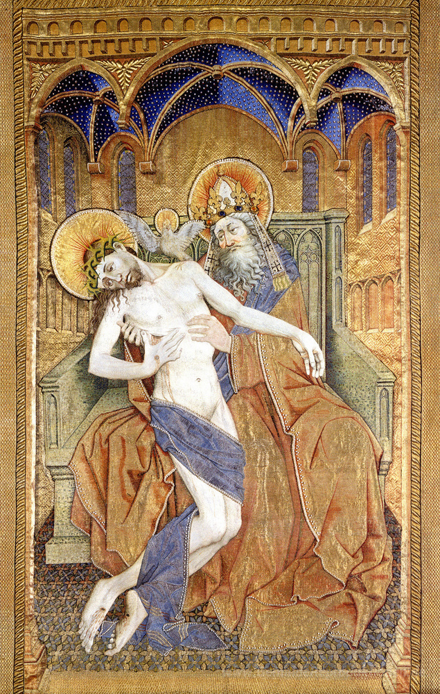 Wir bieten Ihnen eine handgefertigte Reproduktion auf Leinwand des berühmten Kunstwerks 'Holy Trinity Gold-, Silber- und Seidenstickerei, Perlen, Glasper' von Robert Campin, aus dem Reproduktionsmuseum.