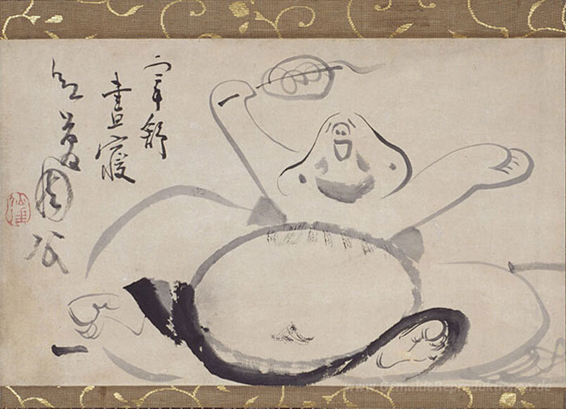 Wir bieten Ihnen eine handgefertigte Reproduktion auf Leinwand des berühmten Kunstwerks 'Hotei Wakes von einem Nap' von Sengai, aus dem Reproduktionsmuseum.