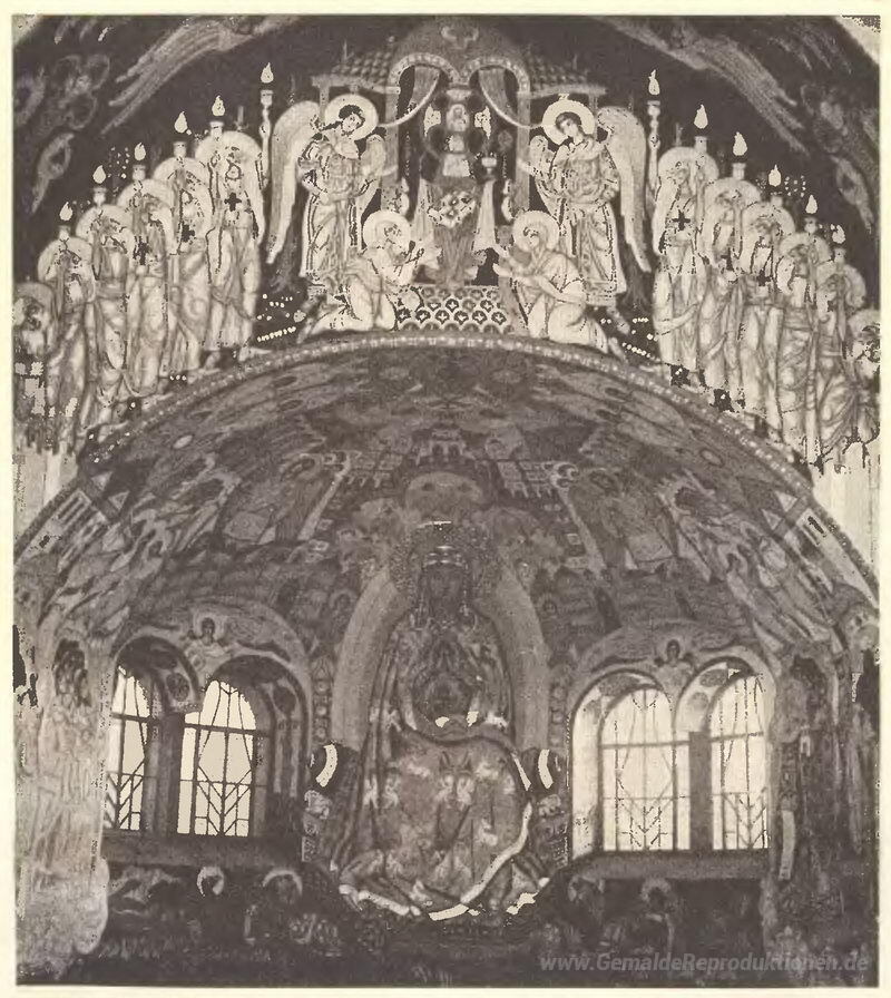 Wir bieten Ihnen eine handgefertigte Reproduktion auf Leinwand des berühmten Kunstwerks 'Interne Ausmalung der Kirche in Talashkino' von Nicholas Roerich, aus dem Reproduktionsmuseum.