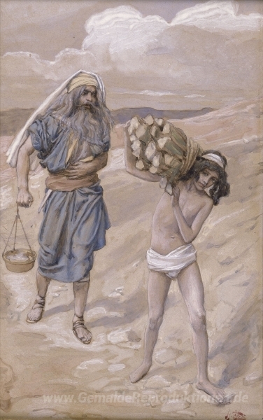 Wir bieten Ihnen eine handgefertigte Reproduktion auf Leinwand des berühmten Kunstwerks 'Isaac Trägt das Holz für sein Opfer' von James Tissot, aus dem Reproduktionsmuseum.