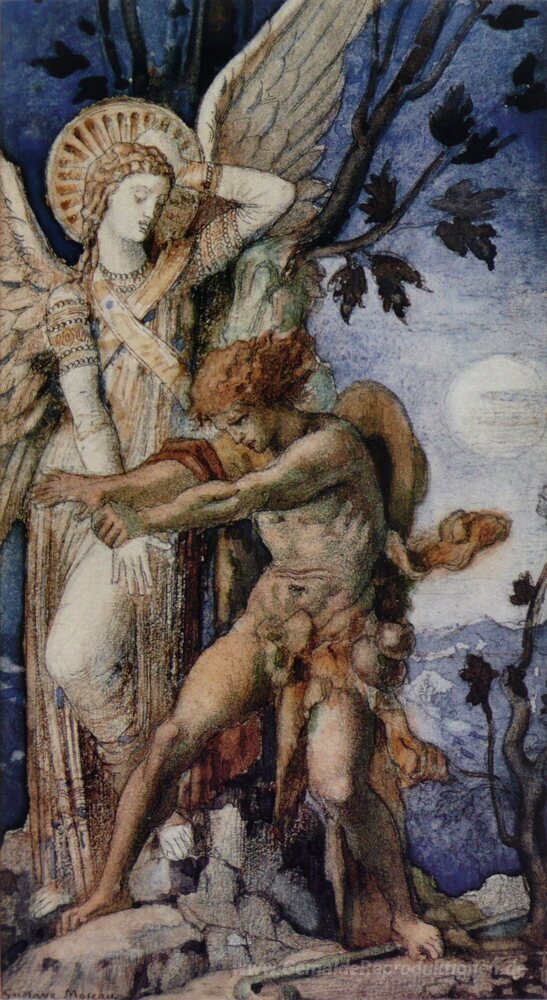 Wir bieten Ihnen eine handgefertigte Reproduktion auf Leinwand des berühmten Kunstwerks 'Jacob und der Engel' von Gustave Moreau, aus dem Reproduktionsmuseum.