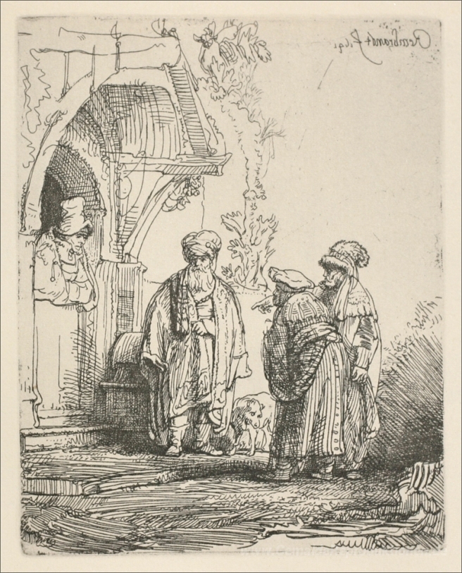 Wir bieten Ihnen eine handgefertigte Reproduktion auf Leinwand des berühmten Kunstwerks 'Jakob mit Laban' von Rembrandt, aus dem Reproduktionsmuseum.